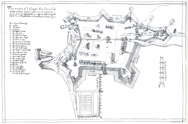 | Fort St. George. Quelle: https://en.wikipedia.org/wiki/File:FortStGeorgePophamColonyJohnHuntMap.gif | |||