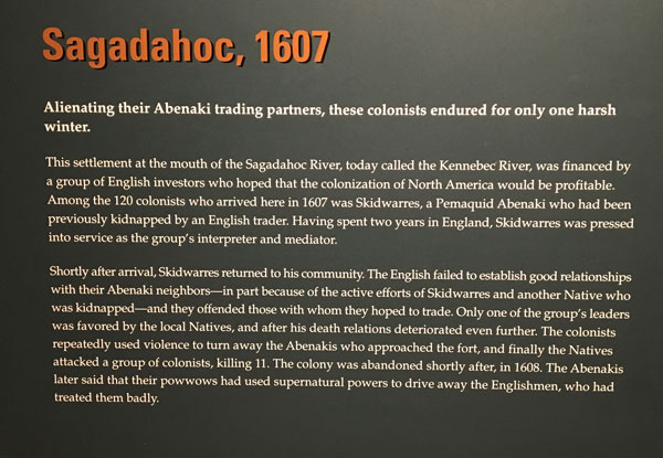 | Sommer 1608 | George Popham Expedition 1607-1608 - Die Abenaki griffen Fort St. George an und töteten 11 Siedler. Die Kolonisten hatten nie ein gutes Verhältnis zu den Abenaki-Indianern. Wahrscheinlich auch deshalb, weil Skiddwarres zu den Abenaki-Indianern fliehen konnte und dann bei den Abenaki Stimmung gegen die Engländer machte. Skiddwarres wurde während der Expedition von 1605 entlang der Nordostküste von George Weymouth gefangen genommen, nach England gebracht und von Gilbert nach Fort St. George zurückgebracht. | Kennebec (Abenaki) | Skidwarres |