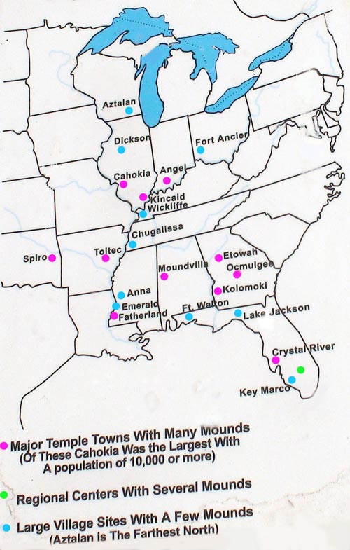 | Fundstellen der Mounds der Mississippi-Kultur in der Mississippi-Region. Quelle: Thomet Daniel, aufgenommen 2011 im Aztalan State Park, Wisconsin. | |||