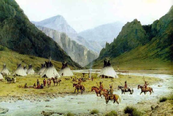 | Dorf der Arapaho. Künstler John Walter Scott. Quelle: https://americangallery20th.wordpress.com/2010/07/20/john-walter-scott-1907-1987/ | |||
