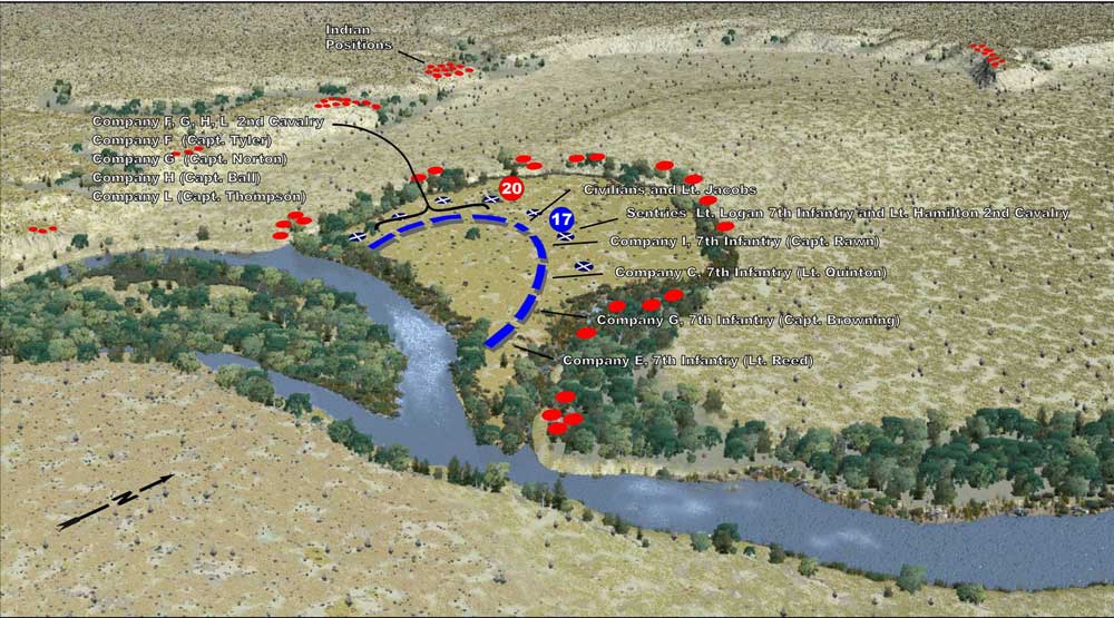 | 20. Dezember 1876 | Entlang des Hanging Woman Creek befanden sich 4 Dörfer der Oglala (Crazy Horse), Northern Cheyenne (Dull Knife, Little Wolf), Miniconjou (Lame Deer) und Sans Arc mit ca. 800 Zelten. | Oglala (Lakota) Northern Cheyenne (Cheyenne) Northern Cheyenne (Cheyenne) Miniconjou (Lakota) Northern Cheyenne (Cheyenne) Sans Arc (Lakota) | Crazy Horse Dull Knife Little Wolf Lame Deer Two Moons |