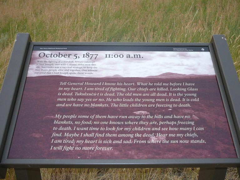 | Bear Paw Battlefield, eine der Gedenktafeln mit der Kapitulationsrede von Chief Joseph. Quelle: Thomet Daniel 2007 | |||