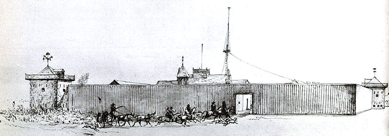 | Fort Union, 1852, gemalt von dem Schweizer Maler Rudolph Friedrich Kurz. Quelle: http://www.zeno.org/Kunstwerke/B/Kurz, Rudolph Friedrich: Fort Union an der Mündung des Yellowstone. | |||