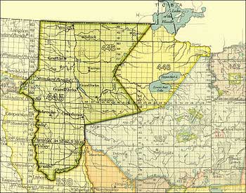 | Von den Ojibwe im Vertrag von Old Crossing abgetretenes Land. Quelle: http://en.wikipedia.org/wiki/Treaty_of_Old_Crossing | |||
