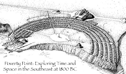 | 2500 v. Chr. | In der Nähe der Ortschaft Poverty Point in Louisiana, etwa 80 km östlich von Watson Brake, wurde ein riesiger Komplex von Erdwerken errichtet. Über einen Zeitraum von 5 Jahrhunderten entstand ein Erdwall aus 6 konzentrischen Halbkreisen mit einer Länge von ca. 11 km. Der Autor Roger G. Kennedy schätzt, dass etwa 10 Millionen Tonkörbe für dieses Monument benötigt wurden. | - | - |