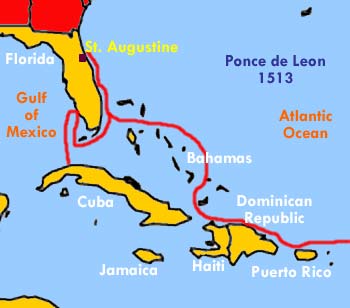 | Reiseroute von Ponce de León 1513 Quelle: http://www.westmeade.net/Library/EuropeanExplorers/PonceDeLeon.html | |||
