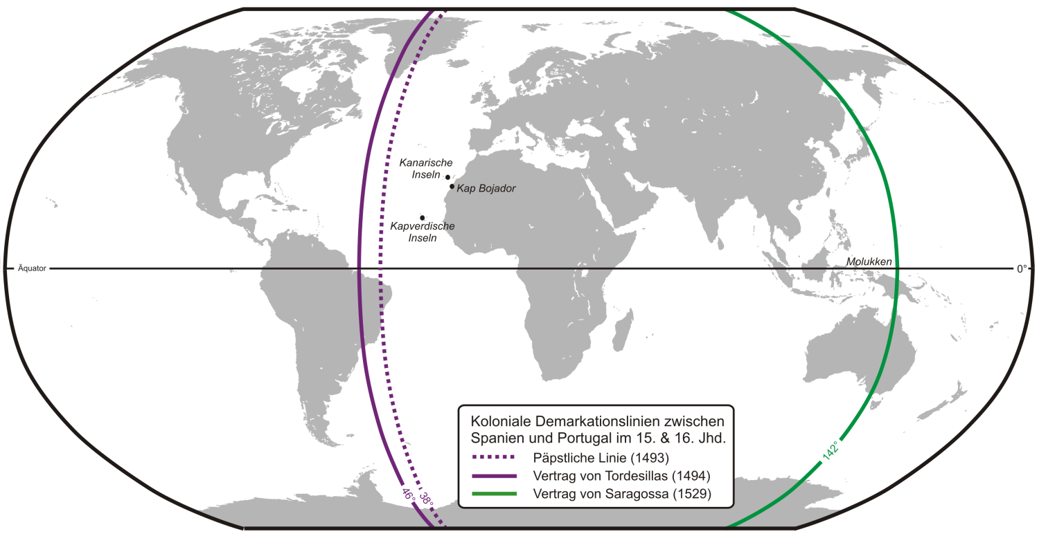 | Demarkationslinien zwischen Spanien und Portugal 1493, 1494 und 1529. Quelle: https://de.wikipedia.org/wiki/Vertrag_von_Tordesillas | |||