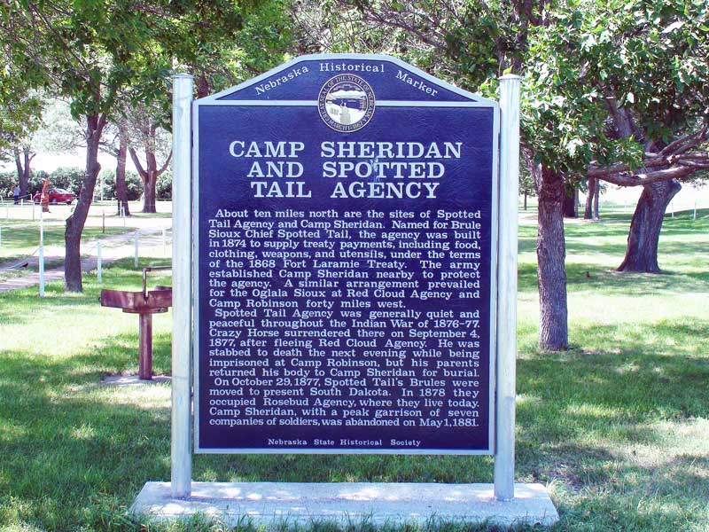 | März 1874 | Die Spotted Tail Agency wurde für die Brule-Lakota im Nordwesten Nebraskas gebaut. Sie lag etwa 40 Meilen östlich der Red Cloud Agency. Zum Schutz der Agentur wurde in der Nähe das Camp Sheridan errichtet. Am 29. Oktober 1877 wurden die Brule-Lakota in die neue Rosebud-Reservation in Süd-Dakota umgesiedelt, wo sie bis heute leben. Camp Sheridan war mit bis zu 6 Kompanien besetzt und wurde am 1. Mai 1881 aufgegeben. | Brule (Lakota) | Spotted Tail |