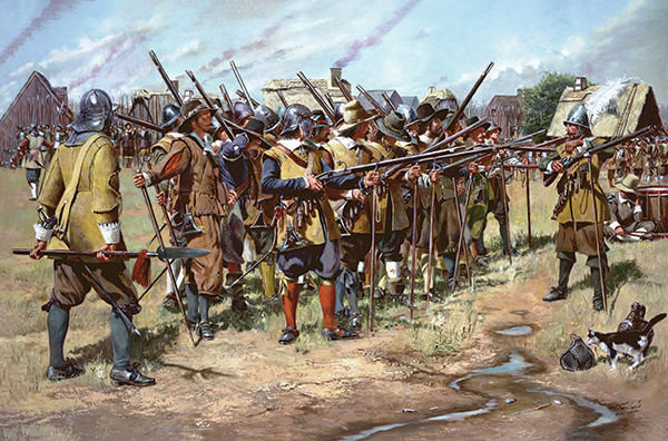 | Milizionäre trainieren den Umgang mit Matchlock-Gewehren und Musketen. Quelle: https://www.historynet.com/king-philips-war-and-a-fight-neither-side-wanted/ | |||