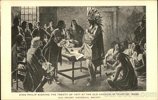| Philipp unterzeichnete den Vertrag von Taunton 1671. Quelle: https://www.cardcow.com/469718/king-philip-signing-treaty-1671-taunton-massachusetts/ | |||