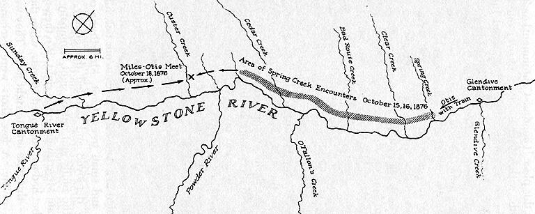 | 18. Oktober 1876 | Miles Winter Expedition 1876 - Colonel Miles und Colonel Otis trafen sich am östlichen Ufer des Custer Creek, etwa fünf Meilen vom Yellowstone River entfernt. Colonel Miles begann, die Hunkpapa-Indianer zu verfolgen, und Colonel Otis marschierte weiter in Richtung des 'Cantonment on Tongue River'. | Hunkpapa (Lakota) Hunkpapa (Lakota) Hunkpapa (Lakota) | Gall Crow King Sitting Bull |
