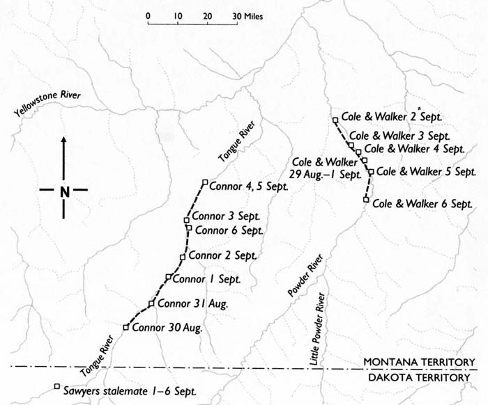| 5. September 1865 | Powder River Expedition 1865 - Walker und Cole wurden im Gebiet nördlich der heutigen Stadt Powderville in Montana von 1000 Cheyenne und Lakota angegriffen. Artillerie hielt die Indianer auf Abstand. Häuptling Roman Nose von den Cheyenne ritt mehrmals vor den Reihen der Soldaten hin und her, ohne getroffen zu werden. Der Medizinmann der Northern Cheyenne, Ice, hatte eine Kriegshaube angefertigt, die Roman Nose vor feindlichen Kugeln schützen sollte. Daraufhin gaben die Hunkpapa, Sans Arc und Blackfeet den Kampf auf und kehrten in ihre Lager zurück. Diese alarmierten die weiter südlich lagernden Oglala unter Red Cloud und die Northern Cheyenne unter Little Wolf. | Hunkpapa (Lakota) Oglala (Lakota) Northern Cheyenne (Cheyenne) Sans Arc (Lakota) Blackfoot (Lakota) Northern Cheyenne (Cheyenne) | Sitting Bull Red Cloud Little Wolf Roman Nose |